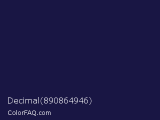 Decimal 890864946 Color is a very dark indigo color and the nearest color is Bunting #151f4c. Hex code #191644 and RGB value is rgb(25,22,68). In RGB color space, this color is composed of 10% red, 9% green, 27% blue, In CMYK color space, this color is composed of 63% cyan, 68% magenta, 0% yellow , 73% black , In HSL color space, this color has a hue angle of 244° , 51% saturation and 18% lightness.