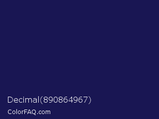 Decimal 890864967 Color is a very dark indigo color and the nearest color is Bunting #151f4c. Hex code #191653 and RGB value is rgb(25,22,83). In RGB color space, this color is composed of 10% red, 9% green, 33% blue, In CMYK color space, this color is composed of 70% cyan, 73% magenta, 0% yellow , 67% black , In HSL color space, this color has a hue angle of 243° , 58% saturation and 21% lightness.
