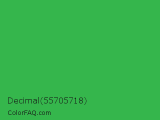 Decimal 55705718 Color is a normal green color and the nearest color is Wageningen Green #34b233. Hex code #35b64c and RGB value is rgb(53,182,76). In RGB color space, this color is composed of 21% red, 71% green, 30% blue, In CMYK color space, this color is composed of 71% cyan, 0% magenta, 58% yellow , 29% black , In HSL color space, this color has a hue angle of 131° , 55% saturation and 46% lightness.