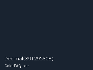 Decimal 891295808 Color is a very dark blue color and the nearest color is Dark Gunmetal #1f262a. Hex code #192330 and RGB value is rgb(25,35,48). In RGB color space, this color is composed of 10% red, 14% green, 19% blue, In CMYK color space, this color is composed of 48% cyan, 27% magenta, 0% yellow , 81% black , In HSL color space, this color has a hue angle of 214° , 32% saturation and 14% lightness.