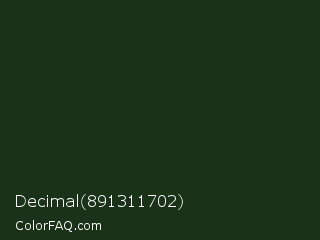 Decimal 891311702 Color is a very dark green color and the nearest color is Seaweed #1b2f11. Hex code #193218 and RGB value is rgb(25,50,24). In RGB color space, this color is composed of 10% red, 20% green, 9% blue, In CMYK color space, this color is composed of 50% cyan, 0% magenta, 52% yellow , 80% black , In HSL color space, this color has a hue angle of 118° , 35% saturation and 15% lightness.