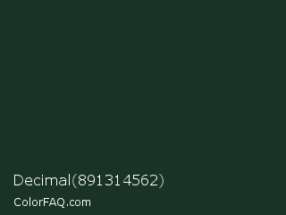 Decimal 891314562 Color is a very dark green color and the nearest color is Celtic #163222. Hex code #193426 and RGB value is rgb(25,52,38). In RGB color space, this color is composed of 10% red, 20% green, 15% blue, In CMYK color space, this color is composed of 52% cyan, 0% magenta, 27% yellow , 80% black , In HSL color space, this color has a hue angle of 149° , 35% saturation and 15% lightness.