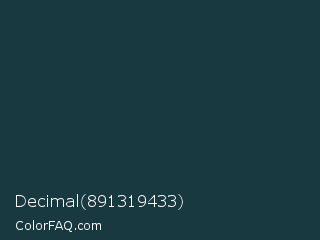 Decimal 891319433 Color is a very dark cyan color and the nearest color is Elephant #123447. Hex code #193941 and RGB value is rgb(25,57,65). In RGB color space, this color is composed of 10% red, 22% green, 25% blue, In CMYK color space, this color is composed of 62% cyan, 12% magenta, 0% yellow , 75% black , In HSL color space, this color has a hue angle of 192° , 44% saturation and 18% lightness.