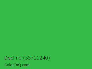 Decimal 55711240 Color is a normal green color and the nearest color is Wageningen Green #34b233. Hex code #35bc48 and RGB value is rgb(53,188,72). In RGB color space, this color is composed of 21% red, 74% green, 28% blue, In CMYK color space, this color is composed of 72% cyan, 0% magenta, 62% yellow , 26% black , In HSL color space, this color has a hue angle of 128° , 56% saturation and 47% lightness.