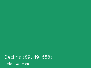 Decimal 891494658 Color is a normal green color and the nearest color is Eucalyptus #278a5b. Hex code #199966 and RGB value is rgb(25,153,102). In RGB color space, this color is composed of 10% red, 60% green, 40% blue, In CMYK color space, this color is composed of 84% cyan, 0% magenta, 33% yellow , 40% black , In HSL color space, this color has a hue angle of 156° , 72% saturation and 35% lightness.