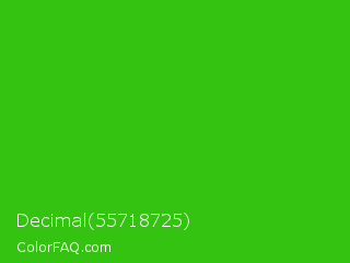 Decimal 55718725 Color is a normal green color and the nearest color is Harlequin Green #46cb18. Hex code #35c311 and RGB value is rgb(53,195,17). In RGB color space, this color is composed of 21% red, 76% green, 7% blue, In CMYK color space, this color is composed of 73% cyan, 0% magenta, 91% yellow , 24% black , In HSL color space, this color has a hue angle of 108° , 84% saturation and 42% lightness.