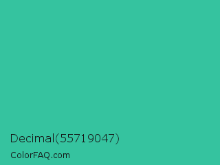Decimal 55719047 Color is a normal cyan color and the nearest color is Shamrock #33cc99. Hex code #35c39f and RGB value is rgb(53,195,159). In RGB color space, this color is composed of 21% red, 76% green, 62% blue, In CMYK color space, this color is composed of 73% cyan, 0% magenta, 18% yellow , 24% black , In HSL color space, this color has a hue angle of 165° , 57% saturation and 49% lightness.