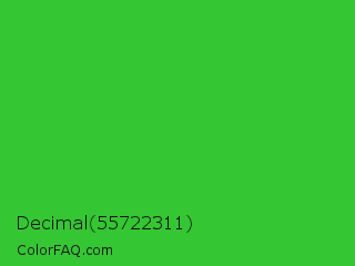 Decimal 55722311 Color is a normal green color and the nearest color is Lime Green #32cd32. Hex code #35c633 and RGB value is rgb(53,198,51). In RGB color space, this color is composed of 21% red, 78% green, 20% blue, In CMYK color space, this color is composed of 73% cyan, 0% magenta, 74% yellow , 22% black , In HSL color space, this color has a hue angle of 119° , 59% saturation and 49% lightness.