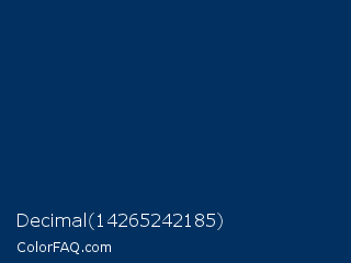 Decimal 14265242185 Color is a very dark blue color and the nearest color is Cool Black #002e63. Hex code #023161 and RGB value is rgb(2,49,97). In RGB color space, this color is composed of 1% red, 19% green, 38% blue, In CMYK color space, this color is composed of 98% cyan, 49% magenta, 0% yellow , 62% black , In HSL color space, this color has a hue angle of 210° , 96% saturation and 19% lightness.