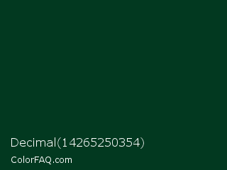 Decimal 14265250354 Color is a very dark green color and the nearest color is Cardin Green #01361c. Hex code #023920 and RGB value is rgb(2,57,32). In RGB color space, this color is composed of 1% red, 22% green, 13% blue, In CMYK color space, this color is composed of 96% cyan, 0% magenta, 44% yellow , 78% black , In HSL color space, this color has a hue angle of 153° , 93% saturation and 12% lightness.