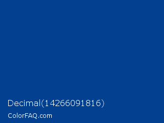 Decimal 14266091816 Color is a dark blue color and the nearest color is Congress Blue #02478e. Hex code #034190 and RGB value is rgb(3,65,144). In RGB color space, this color is composed of 1% red, 25% green, 56% blue, In CMYK color space, this color is composed of 98% cyan, 55% magenta, 0% yellow , 44% black , In HSL color space, this color has a hue angle of 214° , 96% saturation and 29% lightness.