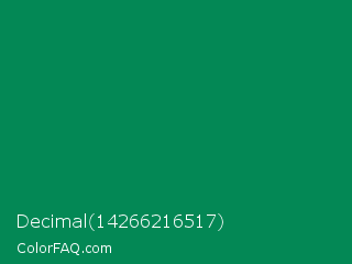 Decimal 14266216517 Color is a dark green color and the nearest color is Spanish Green #009150. Hex code #038855 and RGB value is rgb(3,136,85). In RGB color space, this color is composed of 1% red, 53% green, 33% blue, In CMYK color space, this color is composed of 98% cyan, 0% magenta, 38% yellow , 47% black , In HSL color space, this color has a hue angle of 157° , 96% saturation and 27% lightness.