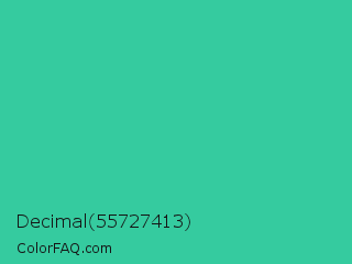 Decimal 55727413 Color is a normal green color and the nearest color is Shamrock #33cc99. Hex code #35cb9f and RGB value is rgb(53,203,159). In RGB color space, this color is composed of 21% red, 80% green, 62% blue, In CMYK color space, this color is composed of 74% cyan, 0% magenta, 22% yellow , 20% black , In HSL color space, this color has a hue angle of 162° , 59% saturation and 50% lightness.