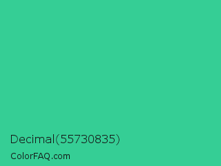 Decimal 55730835 Color is a normal green color and the nearest color is Shamrock #33cc99. Hex code #35ce95 and RGB value is rgb(53,206,149). In RGB color space, this color is composed of 21% red, 81% green, 58% blue, In CMYK color space, this color is composed of 74% cyan, 0% magenta, 28% yellow , 19% black , In HSL color space, this color has a hue angle of 158° , 61% saturation and 51% lightness.