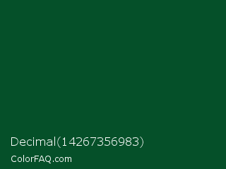 Decimal 14267356983 Color is a very dark green color and the nearest color is Kaitoke Green #004620. Hex code #055029 and RGB value is rgb(5,80,41). In RGB color space, this color is composed of 2% red, 31% green, 16% blue, In CMYK color space, this color is composed of 94% cyan, 0% magenta, 49% yellow , 69% black , In HSL color space, this color has a hue angle of 149° , 88% saturation and 17% lightness.
