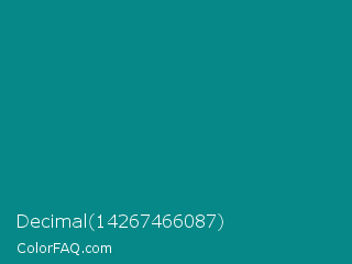 Decimal 14267466087 Color is a dark cyan color and the nearest color is Dark Cyan #008b8b. Hex code #058887 and RGB value is rgb(5,136,135). In RGB color space, this color is composed of 2% red, 53% green, 53% blue, In CMYK color space, this color is composed of 96% cyan, 0% magenta, 1% yellow , 47% black , In HSL color space, this color has a hue angle of 180° , 93% saturation and 28% lightness.