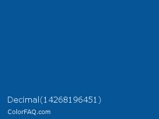 Decimal 14268196451 Color is a normal blue color and the nearest color is Medium Electric Blue #035096. Hex code #065597 and RGB value is rgb(6,85,151). In RGB color space, this color is composed of 2% red, 33% green, 59% blue, In CMYK color space, this color is composed of 96% cyan, 44% magenta, 0% yellow , 41% black , In HSL color space, this color has a hue angle of 207° , 92% saturation and 31% lightness.