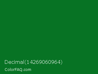 Decimal 14269060964 Color is a dark green color and the nearest color is La Salle Green #087830. Hex code #077324 and RGB value is rgb(7,115,36). In RGB color space, this color is composed of 3% red, 45% green, 14% blue, In CMYK color space, this color is composed of 94% cyan, 0% magenta, 69% yellow , 55% black , In HSL color space, this color has a hue angle of 136° , 89% saturation and 24% lightness.