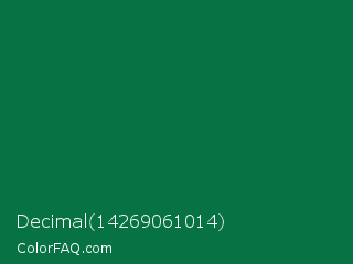 Decimal 14269061014 Color is a dark green color and the nearest color is Dartmouth Green #00703c. Hex code #077344 and RGB value is rgb(7,115,68). In RGB color space, this color is composed of 3% red, 45% green, 27% blue, In CMYK color space, this color is composed of 94% cyan, 0% magenta, 41% yellow , 55% black , In HSL color space, this color has a hue angle of 154° , 89% saturation and 24% lightness.