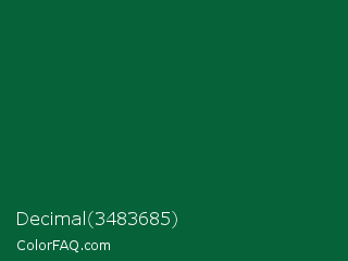 Decimal 3483685 Color is a very dark green color and the nearest color is Cadmium Green #006b3c. Hex code #056239 and RGB value is rgb(5,98,57). In RGB color space, this color is composed of 2% red, 38% green, 22% blue, In CMYK color space, this color is composed of 95% cyan, 0% magenta, 42% yellow , 62% black , In HSL color space, this color has a hue angle of 154° , 90% saturation and 20% lightness.