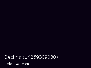 Decimal 14269309080 Color is a almost black violet color and the nearest color is Jaguar #080110. Hex code #080112 and RGB value is rgb(8,1,18). In RGB color space, this color is composed of 3% red, 0% green, 7% blue, In CMYK color space, this color is composed of 56% cyan, 94% magenta, 0% yellow , 93% black , In HSL color space, this color has a hue angle of 265° , 89% saturation and 4% lightness.