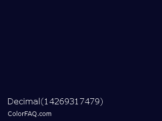 Decimal 14269317479 Color is a almost black blue color and the nearest color is Deep Ebony #0c0b1d. Hex code #080927 and RGB value is rgb(8,9,39). In RGB color space, this color is composed of 3% red, 4% green, 15% blue, In CMYK color space, this color is composed of 79% cyan, 77% magenta, 0% yellow , 85% black , In HSL color space, this color has a hue angle of 238° , 66% saturation and 9% lightness.