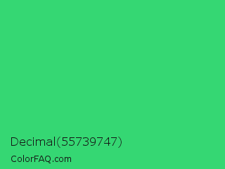 Decimal 55739747 Color is a normal green color and the nearest color is UFO Green #3cd070. Hex code #35d773 and RGB value is rgb(53,215,115). In RGB color space, this color is composed of 21% red, 84% green, 45% blue, In CMYK color space, this color is composed of 75% cyan, 0% magenta, 47% yellow , 16% black , In HSL color space, this color has a hue angle of 143° , 67% saturation and 53% lightness.