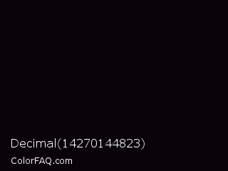 Decimal 14270144823 Color is a almost black magenta color and the nearest color is Jaguar #080110. Hex code #090309 and RGB value is rgb(9,3,9). In RGB color space, this color is composed of 4% red, 1% green, 4% blue, In CMYK color space, this color is composed of 0% cyan, 67% magenta, 0% yellow , 96% black , In HSL color space, this color has a hue angle of 300° , 50% saturation and 2% lightness.