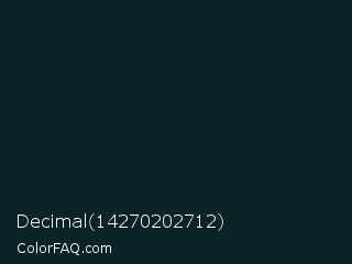 Decimal 14270202712 Color is a almost black cyan color and the nearest color is Firefly #0e2a30. Hex code #092326 and RGB value is rgb(9,35,38). In RGB color space, this color is composed of 4% red, 14% green, 15% blue, In CMYK color space, this color is composed of 76% cyan, 8% magenta, 0% yellow , 85% black , In HSL color space, this color has a hue angle of 186° , 62% saturation and 9% lightness.