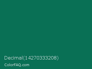 Decimal 14270333208 Color is a dark cyan color and the nearest color is Watercourse #056f57. Hex code #097056 and RGB value is rgb(9,112,86). In RGB color space, this color is composed of 4% red, 44% green, 34% blue, In CMYK color space, this color is composed of 92% cyan, 0% magenta, 23% yellow , 56% black , In HSL color space, this color has a hue angle of 165° , 85% saturation and 24% lightness.