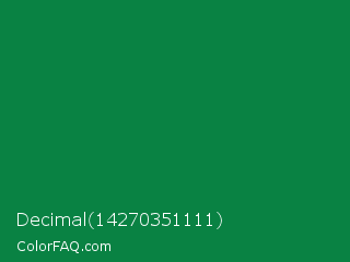 Decimal 14270351111 Color is a dark green color and the nearest color is Salem #097f4b. Hex code #098243 and RGB value is rgb(9,130,67). In RGB color space, this color is composed of 4% red, 51% green, 26% blue, In CMYK color space, this color is composed of 93% cyan, 0% magenta, 48% yellow , 49% black , In HSL color space, this color has a hue angle of 149° , 87% saturation and 27% lightness.