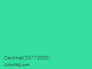 Decimal 55772055 Color is a normal green color and the nearest color is Shamrock #33cc99. Hex code #35de9d and RGB value is rgb(53,222,157). In RGB color space, this color is composed of 21% red, 87% green, 62% blue, In CMYK color space, this color is composed of 76% cyan, 0% magenta, 29% yellow , 13% black , In HSL color space, this color has a hue angle of 157° , 72% saturation and 54% lightness.