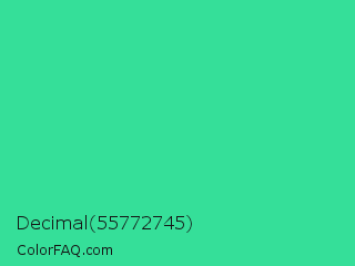 Decimal 55772745 Color is a normal green color and the nearest color is Shamrock #33cc99. Hex code #35df99 and RGB value is rgb(53,223,153). In RGB color space, this color is composed of 21% red, 87% green, 60% blue, In CMYK color space, this color is composed of 76% cyan, 0% magenta, 31% yellow , 13% black , In HSL color space, this color has a hue angle of 155° , 73% saturation and 54% lightness.