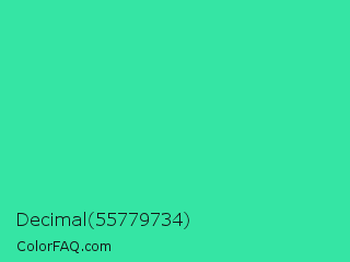 Decimal 55779734 Color is a normal green color and the nearest color is Eucalyptus #44d7a8. Hex code #35e5a4 and RGB value is rgb(53,229,164). In RGB color space, this color is composed of 21% red, 90% green, 64% blue, In CMYK color space, this color is composed of 77% cyan, 0% magenta, 28% yellow , 10% black , In HSL color space, this color has a hue angle of 158° , 77% saturation and 55% lightness.