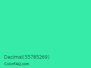 Decimal 55785269 Color is a normal green color and the nearest color is Eucalyptus #44d7a8. Hex code #35eba7 and RGB value is rgb(53,235,167). In RGB color space, this color is composed of 21% red, 92% green, 65% blue, In CMYK color space, this color is composed of 77% cyan, 0% magenta, 29% yellow , 8% black , In HSL color space, this color has a hue angle of 158° , 82% saturation and 56% lightness.