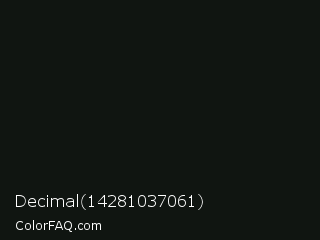 Decimal 14281037061 Color is a almost black green color and the nearest color is Racing Green #0c1911. Hex code #101511 and RGB value is rgb(16,21,17). In RGB color space, this color is composed of 6% red, 8% green, 7% blue, In CMYK color space, this color is composed of 24% cyan, 0% magenta, 19% yellow , 92% black , In HSL color space, this color has a hue angle of 132° , 14% saturation and 7% lightness.