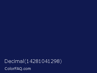 Decimal 14281041298 Color is a very dark blue color and the nearest color is Bunting #151f4c. Hex code #101950 and RGB value is rgb(16,25,80). In RGB color space, this color is composed of 6% red, 10% green, 31% blue, In CMYK color space, this color is composed of 80% cyan, 69% magenta, 0% yellow , 69% black , In HSL color space, this color has a hue angle of 232° , 67% saturation and 19% lightness.