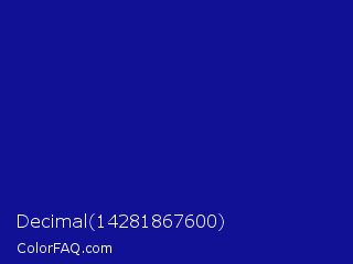 Decimal 14281867600 Color is a normal blue color and the nearest color is Ultramarine #120a8f. Hex code #111196 and RGB value is rgb(17,17,150). In RGB color space, this color is composed of 7% red, 7% green, 59% blue, In CMYK color space, this color is composed of 89% cyan, 89% magenta, 0% yellow , 41% black , In HSL color space, this color has a hue angle of 240° , 80% saturation and 33% lightness.
