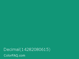 Decimal 14282080615 Color is a normal cyan color and the nearest color is Gossamer #069b81. Hex code #119677 and RGB value is rgb(17,150,119). In RGB color space, this color is composed of 7% red, 59% green, 47% blue, In CMYK color space, this color is composed of 89% cyan, 0% magenta, 21% yellow , 41% black , In HSL color space, this color has a hue angle of 166° , 80% saturation and 33% lightness.
