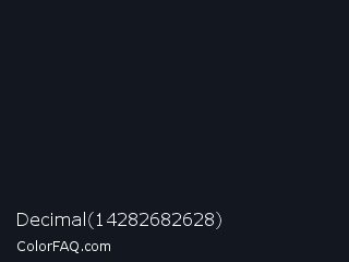 Decimal 14282682628 Color is a very dark blue color and the nearest color is Vulcan #10121d. Hex code #121720 and RGB value is rgb(18,23,32). In RGB color space, this color is composed of 7% red, 9% green, 13% blue, In CMYK color space, this color is composed of 44% cyan, 28% magenta, 0% yellow , 87% black , In HSL color space, this color has a hue angle of 219° , 28% saturation and 10% lightness.