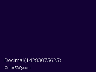 Decimal 14283075625 Color is a very dark violet color and the nearest color is Black Rock #0d0332. Hex code #130135 and RGB value is rgb(19,1,53). In RGB color space, this color is composed of 7% red, 0% green, 21% blue, In CMYK color space, this color is composed of 64% cyan, 98% magenta, 0% yellow , 79% black , In HSL color space, this color has a hue angle of 261° , 96% saturation and 11% lightness.