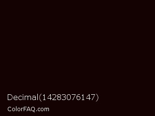 Decimal 14283076147 Color is a almost black red color and the nearest color is Diesel #130000. Hex code #130201 and RGB value is rgb(19,2,1). In RGB color space, this color is composed of 7% red, 1% green, 0% blue, In CMYK color space, this color is composed of 0% cyan, 89% magenta, 95% yellow , 93% black , In HSL color space, this color has a hue angle of 3° , 90% saturation and 4% lightness.