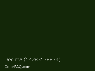 Decimal 14283138834 Color is a almost black green color and the nearest color is Deep Forest Green #182d09. Hex code #132708 and RGB value is rgb(19,39,8). In RGB color space, this color is composed of 7% red, 15% green, 3% blue, In CMYK color space, this color is composed of 51% cyan, 0% magenta, 79% yellow , 85% black , In HSL color space, this color has a hue angle of 99° , 66% saturation and 9% lightness.