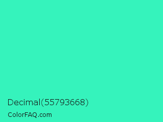 Decimal 55793668 Color is a normal green color and the nearest color is Turquoise #40e0d0. Hex code #35f3bc and RGB value is rgb(53,243,188). In RGB color space, this color is composed of 21% red, 95% green, 74% blue, In CMYK color space, this color is composed of 78% cyan, 0% magenta, 23% yellow , 5% black , In HSL color space, this color has a hue angle of 163° , 89% saturation and 58% lightness.