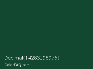 Decimal 14283198976 Color is a very dark green color and the nearest color is Everglade #1c402e. Hex code #134830 and RGB value is rgb(19,72,48). In RGB color space, this color is composed of 7% red, 28% green, 19% blue, In CMYK color space, this color is composed of 74% cyan, 0% magenta, 33% yellow , 72% black , In HSL color space, this color has a hue angle of 153° , 58% saturation and 18% lightness.