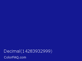 Decimal 14283932999 Color is a normal blue color and the nearest color is Indigo Dye #091f92. Hex code #141893 and RGB value is rgb(20,24,147). In RGB color space, this color is composed of 8% red, 9% green, 58% blue, In CMYK color space, this color is composed of 86% cyan, 84% magenta, 0% yellow , 42% black , In HSL color space, this color has a hue angle of 238° , 76% saturation and 33% lightness.
