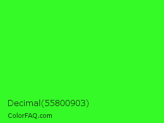 Decimal 55800903 Color is a normal green color and the nearest color is Neon Green #39ff14. Hex code #35fa27 and RGB value is rgb(53,250,39). In RGB color space, this color is composed of 21% red, 98% green, 15% blue, In CMYK color space, this color is composed of 79% cyan, 0% magenta, 84% yellow , 2% black , In HSL color space, this color has a hue angle of 116° , 95% saturation and 57% lightness.