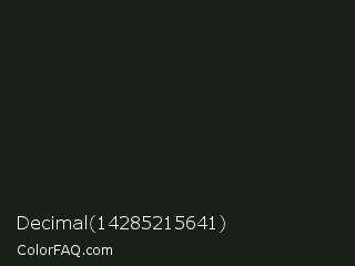 Decimal 14285215641 Color is a very dark green color and the nearest color is Rangoon Green #1c1e13. Hex code #162117 and RGB value is rgb(22,33,23). In RGB color space, this color is composed of 9% red, 13% green, 9% blue, In CMYK color space, this color is composed of 33% cyan, 0% magenta, 30% yellow , 87% black , In HSL color space, this color has a hue angle of 125° , 20% saturation and 11% lightness.