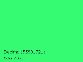 Decimal 55801721 Color is a normal green color and the nearest color is UFO Green #3cd070. Hex code #35fb73 and RGB value is rgb(53,251,115). In RGB color space, this color is composed of 21% red, 98% green, 45% blue, In CMYK color space, this color is composed of 79% cyan, 0% magenta, 54% yellow , 2% black , In HSL color space, this color has a hue angle of 139° , 96% saturation and 60% lightness.
