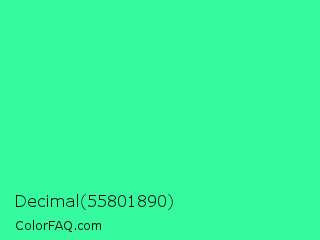 Decimal 55801890 Color is a normal green color and the nearest color is Eucalyptus #44d7a8. Hex code #35fb9e and RGB value is rgb(53,251,158). In RGB color space, this color is composed of 21% red, 98% green, 62% blue, In CMYK color space, this color is composed of 79% cyan, 0% magenta, 37% yellow , 2% black , In HSL color space, this color has a hue angle of 152° , 96% saturation and 60% lightness.